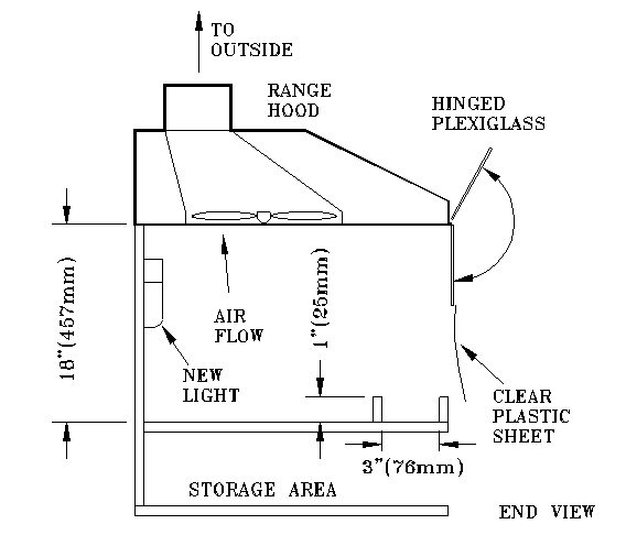 The light in most range hoods are fine for cooking but we need more for painting.  There are some people who are worried that any light source not sealed may explode when exposed to the paint fumes.  I use fluorescent fixtures and to be safe I tape up any openings that fumes may get into.  Another method is to use the clamping lights and have them outside the booth pointing in.  If using this method at least two lamps are needed for each side.  In figure 2 I have shown the added light at the back.  In figure 3 there are two lights clipped onto the front