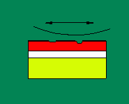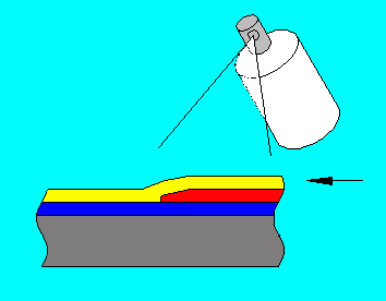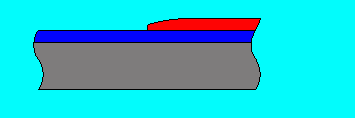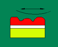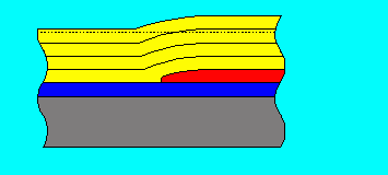 Here is an exaggerated cross section of a model finish with the bottom layer being the plastic. The middle layer is the primer while the red is the paint job. What you are going to try and do is to sand away the hills until the paint is completely flat.