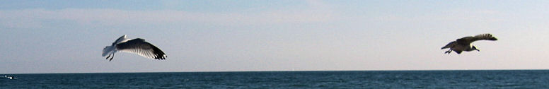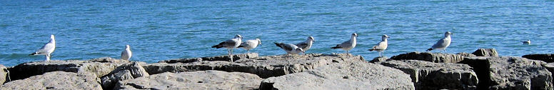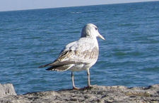 They are white and the young ones are gray and brown. They fly above the rocks on the beach and swim in the lake. They eat everything they find. They eat even from the garbage cans. Sometimes they are alone and sometimes they are in large flocks. |