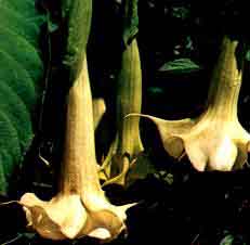 Catalog #63 - Also known as Brugmansia. A magnificent flowering species that grows exceptionally even in the shortest summer months. Can be trained as a tree and winterized for dormancy. The showy pendulous trumpet shaped flowers grow up to 8" (20 cm), & depending on species vary in shades that bloom intermittently. During the evening they give off a musky scent. We carry both the inoxia and sanguinea variety. |