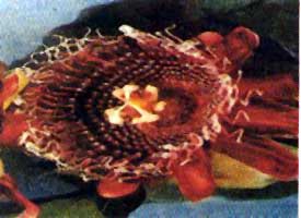 Catalog # 80 - Another robust climbing species of the passiflora variety of 400 vines.This one is known for it's distinct edible melon fruit, oblong shaped yellow green and pulpy used in fruit juices. The 4 inch ( 10 cm ) flowers are purple red, ideal for trellis and baskets. |